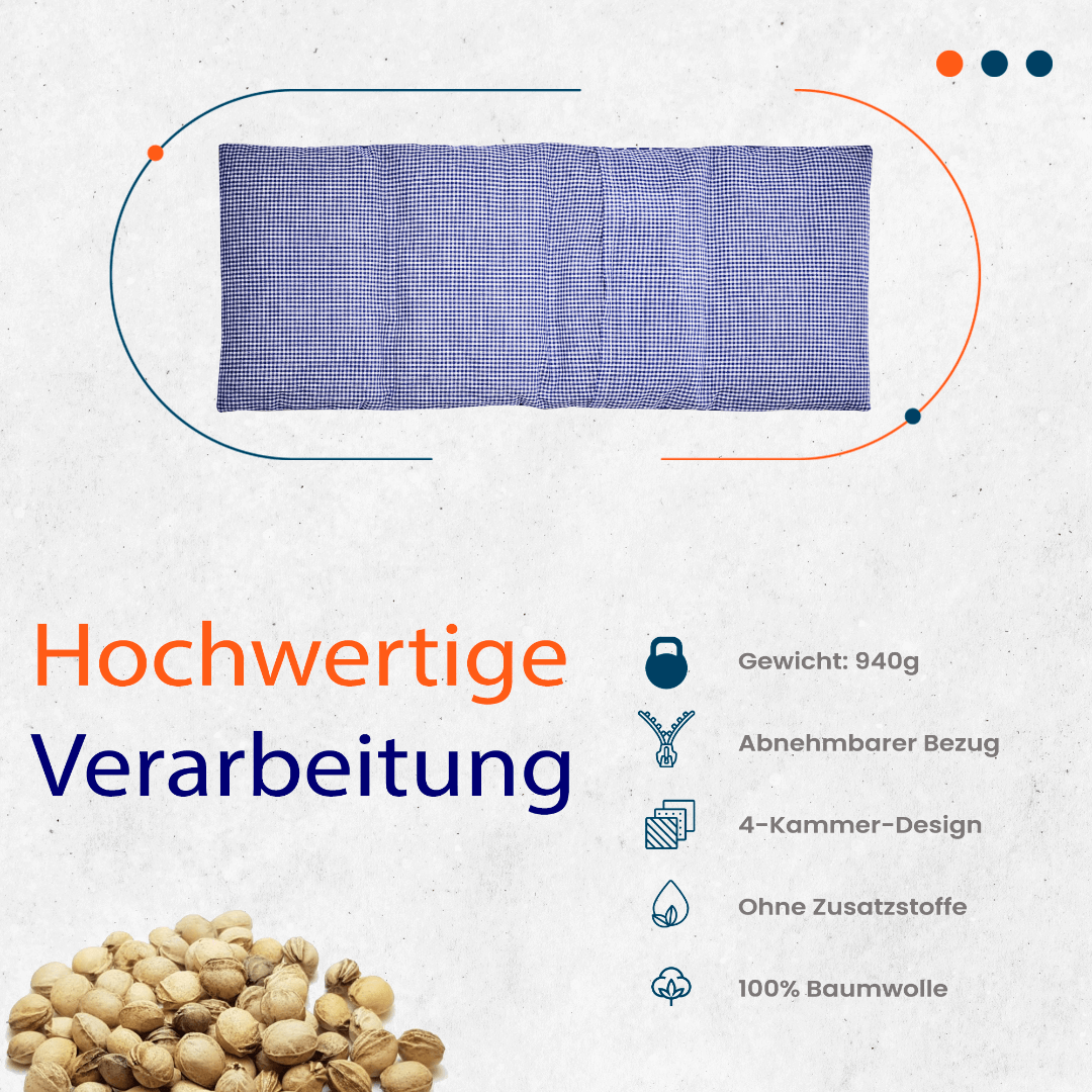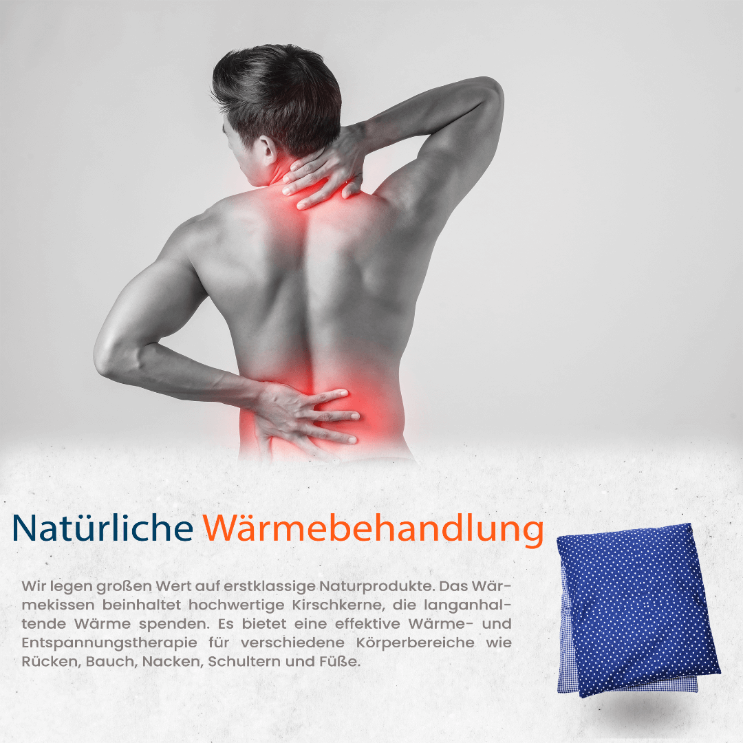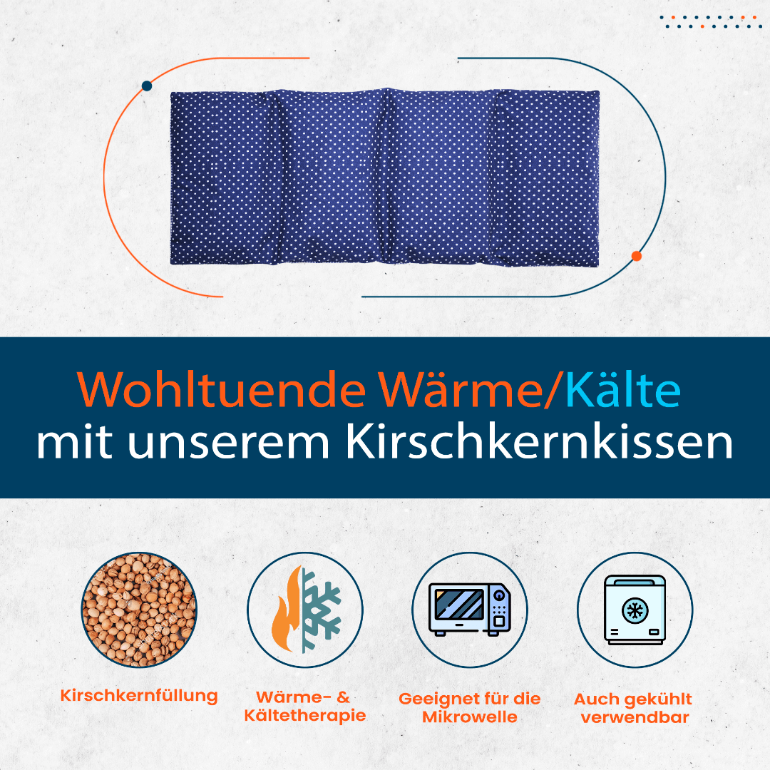 Das Kirschkernkissen mit natürlicher Kirschkernfüllung sorgt für wohltuende und entspannende Wärme und ist zugleich bequem und hautfreundlich. Dank des 4-Kammernsystems bleibt die Wärme gleichmäßig verteilt. Das Kissen lässt sich einfach in der Mikrowelle erwärmen oder im Gefrierfach kühlen, um Schmerzen und Verspannungen zu lindern. Das Kissen ist frei von Zusatzstoffen und ideal für den Einsatz in der Pflege, im medizinischen Bereich, zur Erholung und Wellness, sowie als entspannende Geschenkidee.